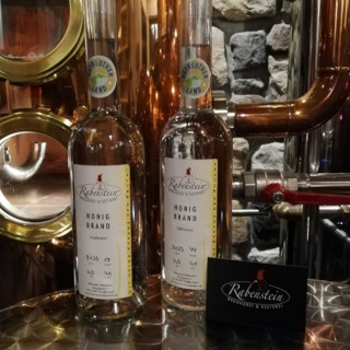 Es ist eine hohe Kunst, aus Honig reinen Alkohol (kein Met!) herzustellen. Das liegt unter anderem daran, dass Honig bis zu 24 verschiedene Zuckerarten enthält. Die Produktion erfordert neben speziellen Reinzuchthefen, einer intensiven monatelangen Maischebetreuung und auch eine penible Überwachung des Brenners. Ist diese Arbeit erfolgreich erledigt, brennen wir die Maische auf modernsten Brenngerät langsam über eine Kolonne mit drei Böden unter Einsatz eines Dephlegmators und eines Katalysators ab. Das Ergebnis ist ein hervorragenderer Honig-Edel-Brand. Produktvariante „Rabenstein's Honey-Shot“ Durch das einrühren einer kleinen Menge Honig im Glas mittels eines Holzstabes wird die Honigintensivität und der Geschmack zu einem einzigartigen Trinkerlebnis! Wählen Sie unsere Produktvariante „Rabenstein's Honey-Shot“ um neben dem Brand auch ein Honigglas mit passendem Honigstäbchen zu erhalten.
